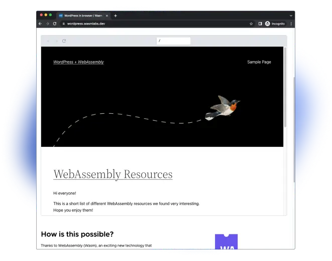 WebAssembly brings existing projects to a new level. Our team compiled PHP, SQLite and WordPress to Wasm to run it directly in your browser. Yo ucan navigate articles and even add comments to the different posts.